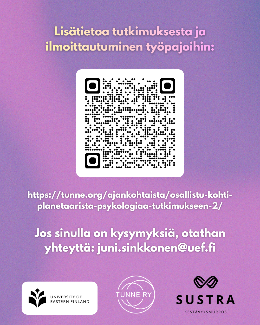 Lämpimästi tervetuloa Kohti planetaarista psykologiaa -tutkimuksen työpajoihin! Työpajat ovat suunnattu psykologeille ja psykologian opiskelijoille, jotka ovat kiinnostuneita pohtimaan, millainen rooli psykologeilla voisi olla ekologisen ja sosiaalisen kestävyyden edistämisessä ekokriisin ajassa. Fasilitoidussa työpajassa pääset pohtimaan tätä teemaa ja planetaarisen psykologian käsitettä yhdessä kollegojen tai opiskelutovereiden kanssa.